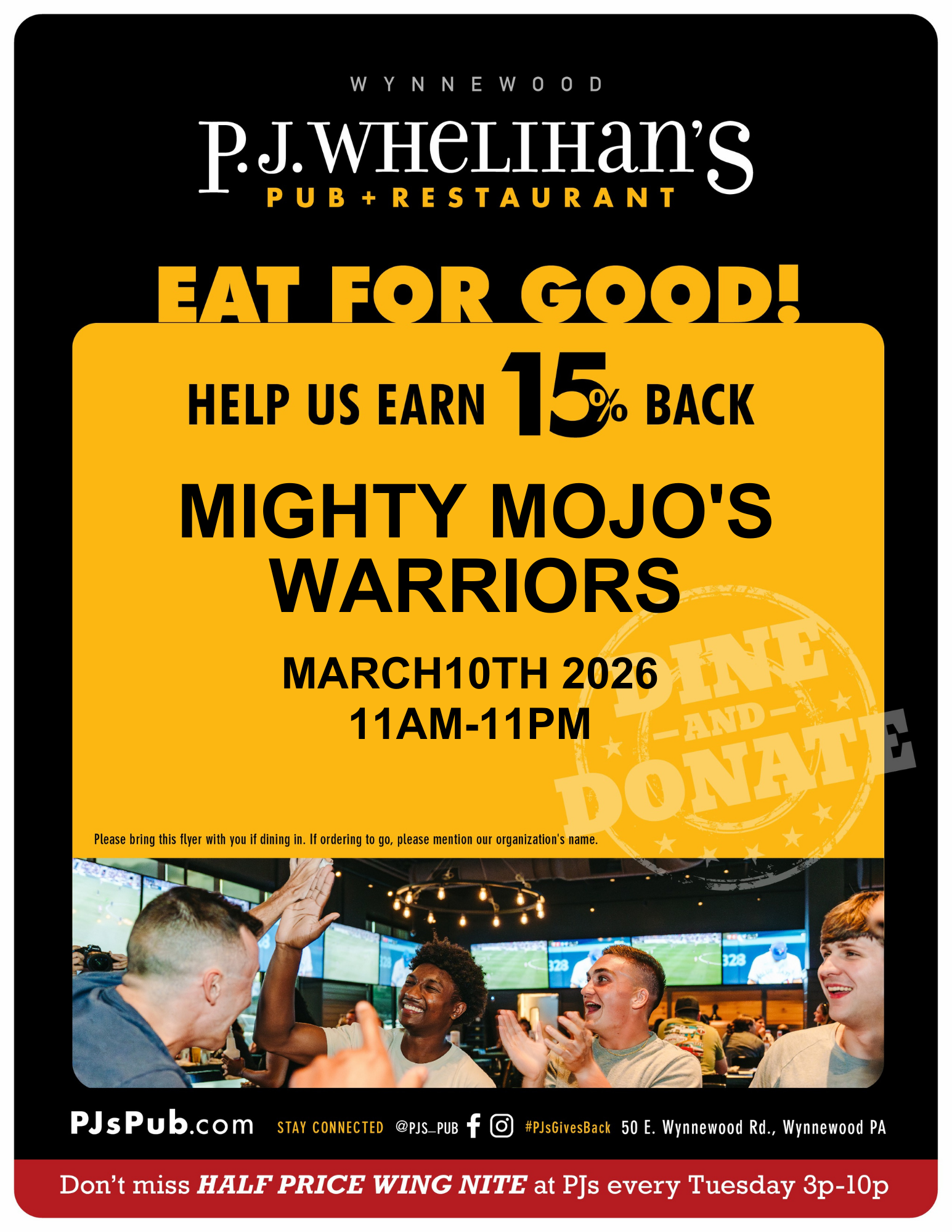 Mighty MoJo's Warriors, and your group will get 15% of your meal’s price donated back!